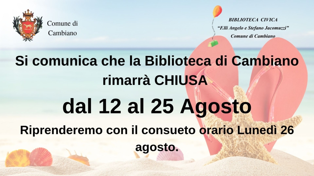 Ingrandisci immagine CHIUSURA ESTIVA 2019 La Biblioteca di Cambiano rimarrà chiusa per ferie dal 12 al 25 agosto. Riprenderemo con il consueto orario da lunedì 26 agosto. La circolazione libraria invece, sarà sospesa per tutto il mese di agosto. Biblio_Editor2025-09-16T15:58:47+02:0019 Luglio 2019|News| Condividi questo articolo! FacebookXRedditLinkedInWhatsAppTelegramTumblrPinterestVkXingEmail Post correlati