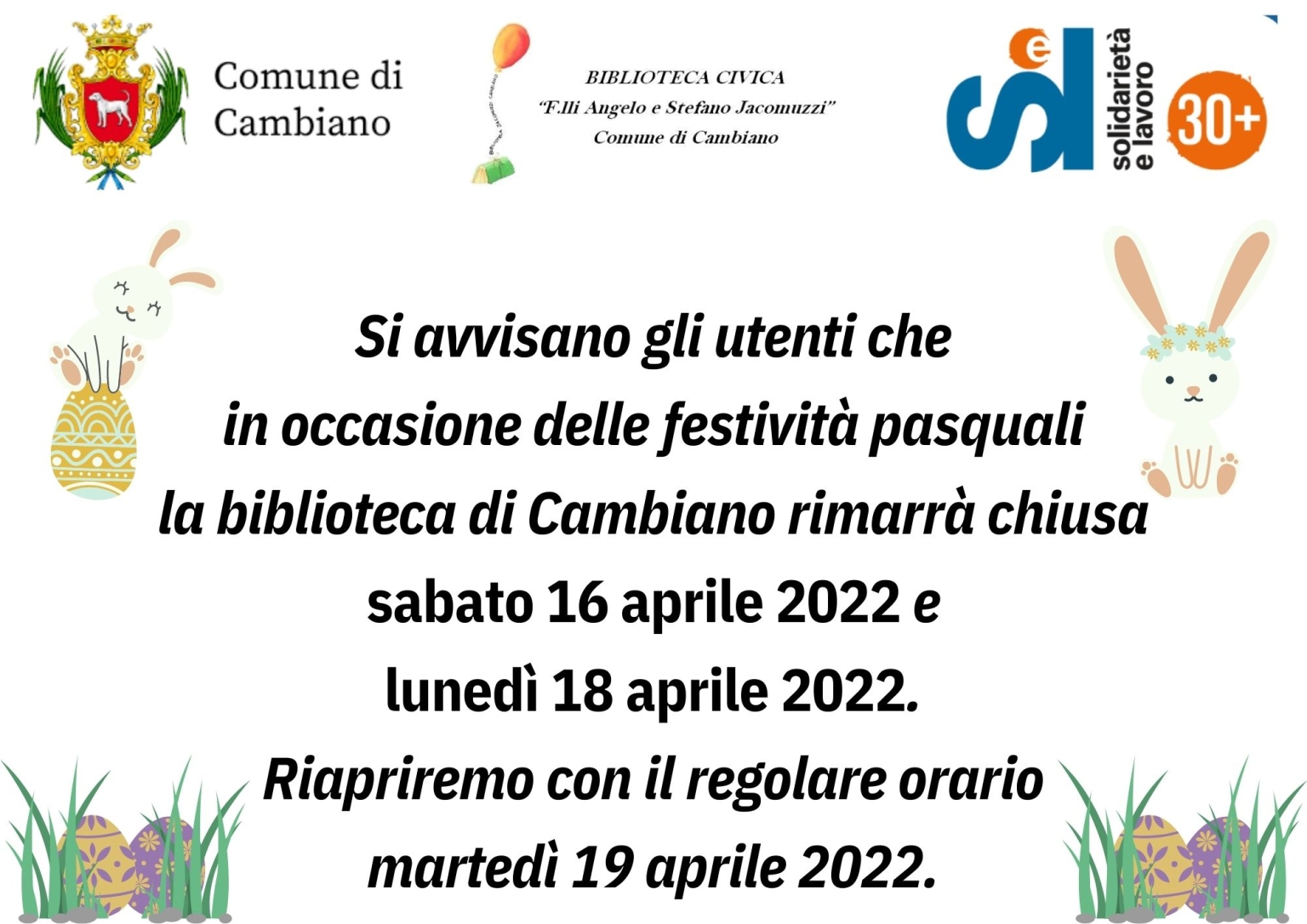 Si comunica che la biblioteca civica “F.lli Angelo e Stefano Jacomuzzi” – via Lagrange n. 1 sarà chiusa sabato 16 aprile 2022 e lunedì 18 aprile in occasione delle festività pasquali.