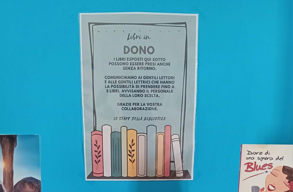 Presso lโatrio della Biblioteca รจ presente lo scaffale dei libri dono.