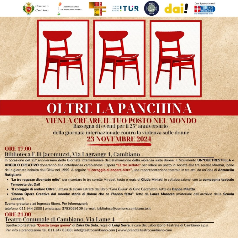 In occasione del ๐๐ยฐ ๐๐ง๐ง๐ข๐ฏ๐๐ซ๐ฌ๐๐ซ๐ข๐จ ๐๐๐ฅ๐ฅ๐ ๐ ๐ข๐จ๐ซ๐ง๐๐ญ๐ ๐ข๐ง๐ญ๐๐ซ๐ง๐๐ณ๐ข๐จ๐ง๐๐ฅ๐ ๐๐จ๐ง๐ญ๐ซ๐จ ๐ฅ๐ ๐ฏ๐ข๐จ๐ฅ๐๐ง๐ณ๐ ๐ฌ๐ฎ๐ฅ๐ฅ๐ ๐๐จ๐ง๐ง๐, il Comune di Cambiano, con il patrocinio della Cittร Metropolitana di Torino, ha organizzato due appuntamenti per ricordare tutte le vittime della violenza di genere e celebrare le donne che ogni giorno lottano per la libertร .