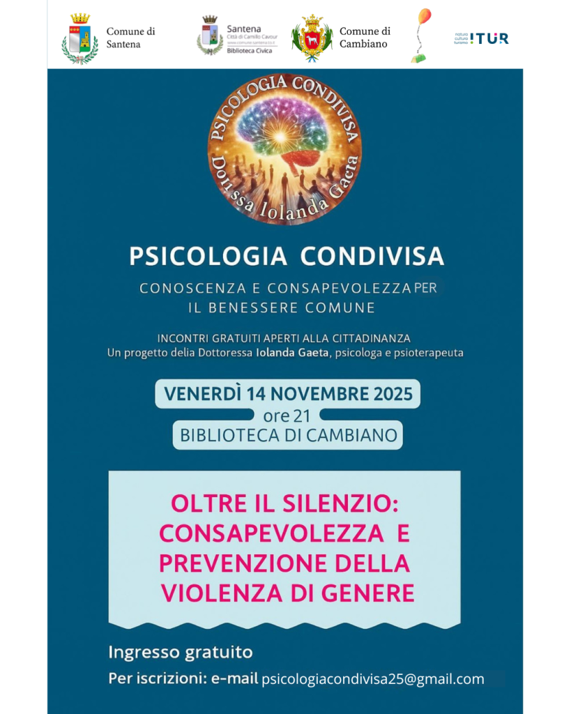 Venerdì 14 novembre alle ore 21:00 a Cambiano, presso la Biblioteca Jacomuzzi, si terrà l’evento dal titolo “Oltre il silenzio: consapevolezza e prevenzione della violenza di genere.”