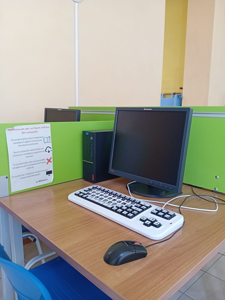 รˆ possibile utilizzare quattro postazioni multimediali con Windows Vista. Per usare i computer รจ necessaria unโ€™iscrizione gratuita, che puรฒ essere fatta al bancone prestiti. Per i minorenni, lโ€™iscrizione devโ€™essere effettuata da un genitore o chi ne fa le veci. I computer sono tutti dotati di firewall per una navigazione sicura e controllata anche per lโ€™utenza piรน giovane. Lโ€™unico servizio a pagamento รจ la stampa dei documenti.